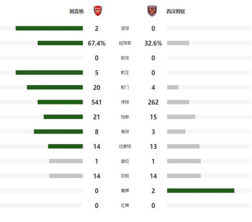 第35分钟阿森纳的进攻,造成了西汉姆联球员马加萨禁区内手球,不过主裁判没有任何表示,3分钟之后,阿森纳的围攻终于取得了回报,埃泽禁区右侧大力抽射被铁锤帮门将奋勇扑出,战旧主的赖斯补射建功,将比分改写为了1-0,进球后的赖斯有情有义没有选择庆祝,半场结束前,卡拉菲奥里的远射被门柱拒绝,错失扩大优势的绝佳机会。